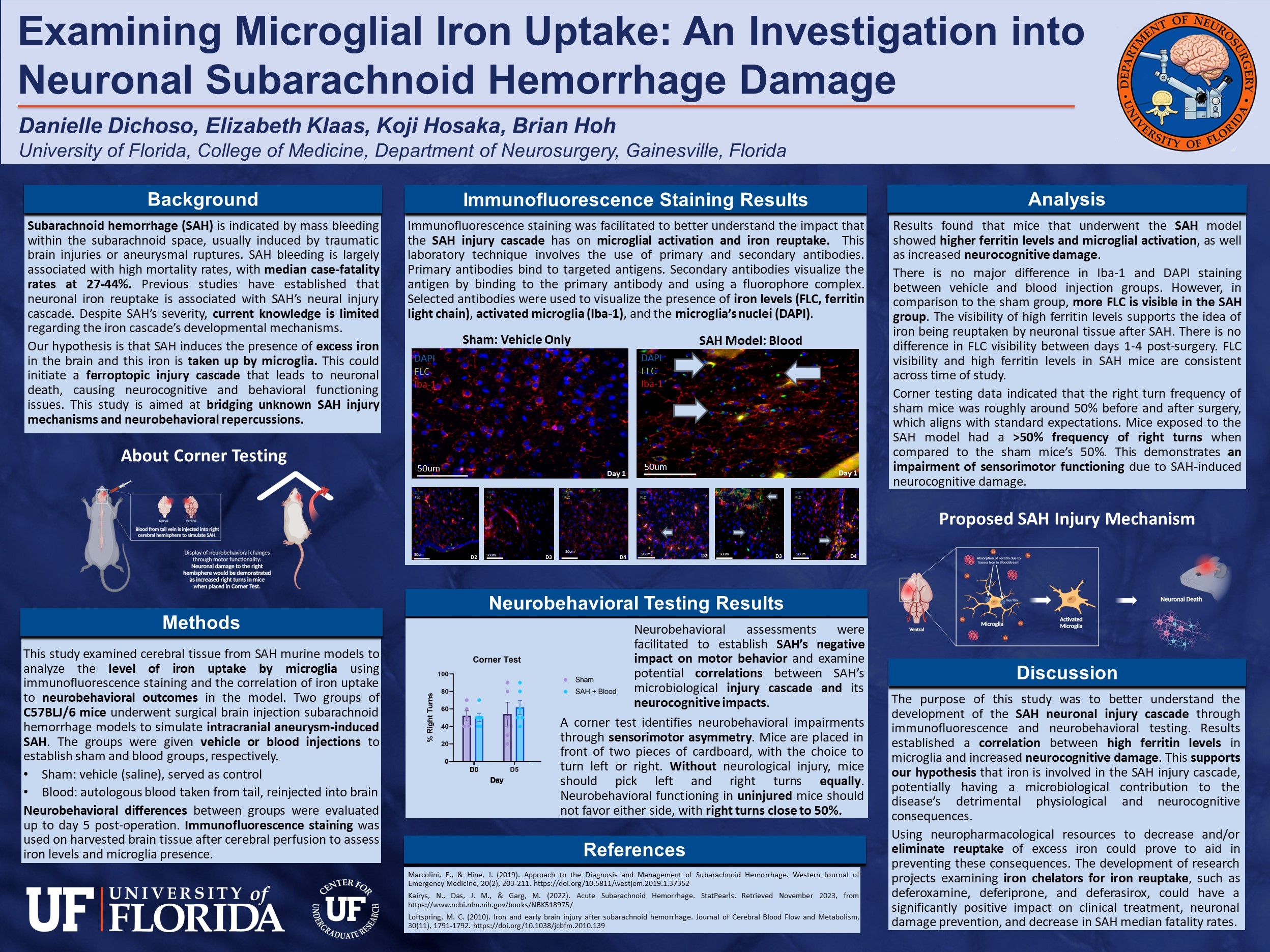 November 2023. Dichoso, D., Klaas, E., Hosaka, K., & Hoh, B. “Examining Microglial Iron Uptake: An Investigation into Neuronal Subarachnoid Hemorrhage Damage”. (Poster, Progress Report).