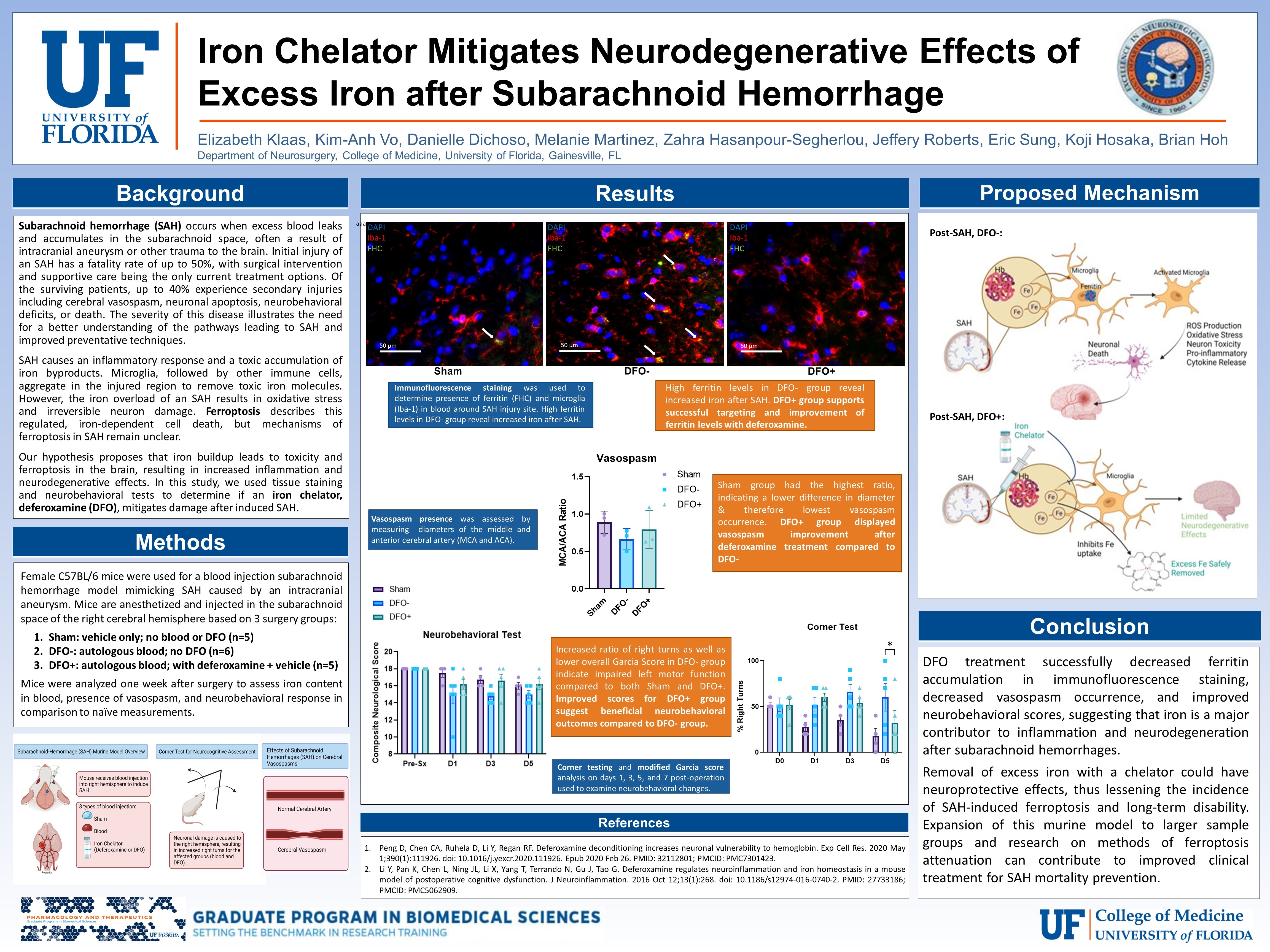 University of Florida College of Medicine’s 13th Annual Celebration of Research Symposium, February 2023. Klaas, E., Vo, K., Dichoso, D., Hosaka, K., & Hoh, B. “Iron Chelator Mitigates Neurodegenerative Effects of Excess Iron after Subarachnoid Hemorrhage”. (Poster).