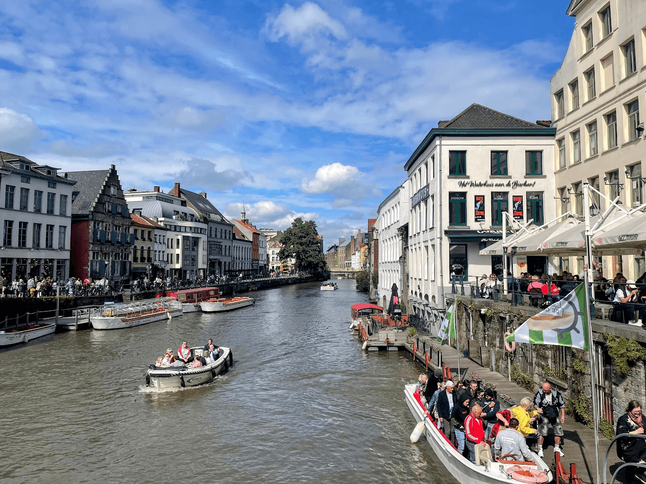 Canal boats floating along the Leie River.